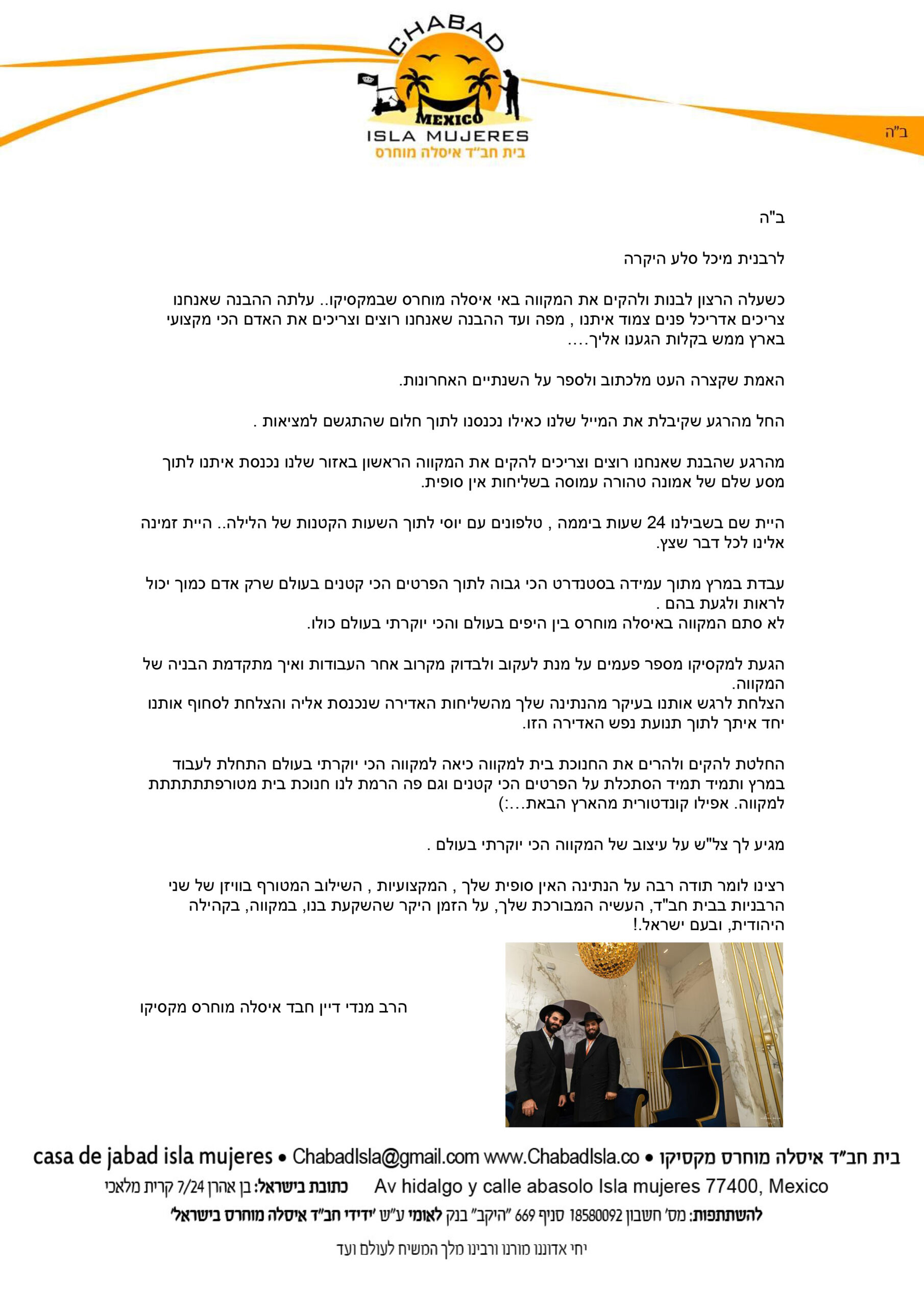 המקווה באיסלה-מוחרס, מקסיקו היה שיעור חזק באמונה. לאחר ביקור שלי בציון של הרבי מליובאוויטש, קיבלתי ממנו מסר: שהמקווה לפני הכל, והוא צריך להיות הכי מפואר והכי מהודר! לימים, קיבלתי מייל מבית חב"ד שבאיסלה-מוחרס בדרישה לעשות "מקווה ברמה הכי גבוהה שיש" ידעתי שהרבי בחר בי אבל לא הבנתי את גודל השליחות. בהזדמנות זו אני רוצה להודות לשליחים – הרב והרבנית יוסי ורבקה בן שמעון, ולרב והרבנית מנדי ורוחמה דיין שזיכו אותי ללמוד עולם שלם של רוחניות וחיבור לרבי. מעבר לאושר שזכינו לפתוח את המקווה, הפכתי להיות מעצבת בין לאומית, זכיתי לראות אלוקות! וכל ימי חיי אודה על הפרויקט והמסע שהוא הביא איתו, כי הוא נתן לי את הכח להמשיך.